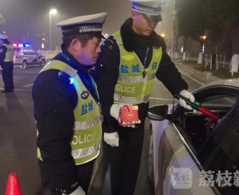 盐城交警“跨年夜”查酒驾 为文明司机送象征“平安”的苹果