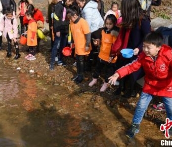 长沙孩童放生鱼苗 湘绣“年年有余”迎新年
