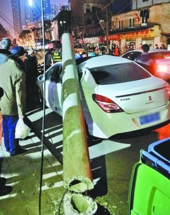 昨天晚上8点左右,一辆大货车经过武昌四美塘路时,将路边的两根水泥电线杆拉断。两根电杆倒下,砸中两辆轿车,并将一名骑单车男子砸伤。