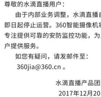 360宣布永久关闭水滴直播平台 将聚焦安防监控