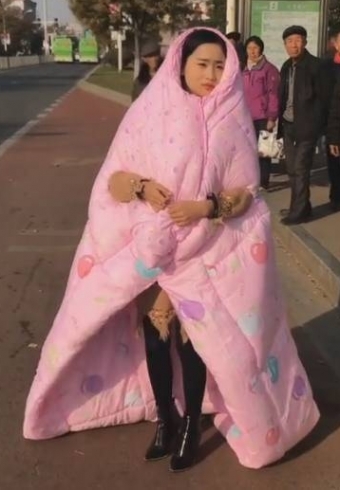 一到冬天,每天最痛苦的时候就是早上出被窝的时候吧!有人说:如果有可能,能不能让我在被窝里冬眠!在公交车站牌竟然发生了这么一幕,一个女孩竟然裹着被子在等车!