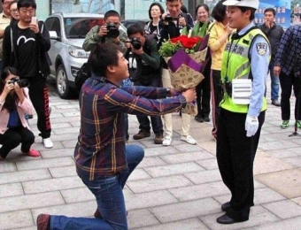 一名男青年单膝跪地手捧鲜花向刚刚执勤后歇息的女交警跪地并且献上鲜花和钻戒求婚。