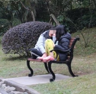 原标题:女子脚踩公园座椅 盘腿而坐聊得欢