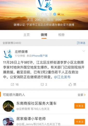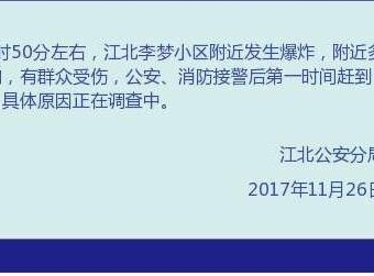 未来网(www.k618.cn中央级新闻媒体)北京11月26日电(记者 韩胜男)中午12:21分,@庄桥微博发文,上午9时许,江北区庄桥街道李梦小区北侧原李家村地块外围空地发生爆炸。有关部门已经到现场开展救援。截至目前,已有2死2重伤若干人正在救治中。公安消防正在继续进行