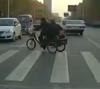 老人骑三轮载老伴过马路 路过宝马车主下车帮推