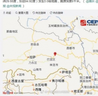 中新网11月18日电 据中国地震台网正式测定,11月18日8时31分在西藏林芝市巴宜区(北纬29.88度,东经94.92度)发生5.0级地震,震源深度6千米。
