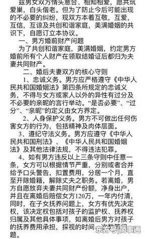 近日,一婚礼主持人小可在虎扑论坛上发布了一份一对新人的婚前协议书,引发热议。据悉,新郎原本准备11月12号举行婚礼,11月11号领证。并已告知亲朋好友,光酒席就订了50桌。