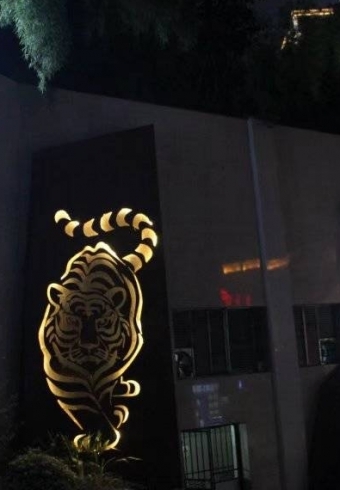 2017年11月13日,在重庆九龙坡区杨家坪一条背街墙壁,花费上千万打造艺术街,一些废旧的铁板镂空成画 ,铁板画中有老虎、斑马、鸡、建筑物等各种各样的画像,在灯光下惟妙惟肖。