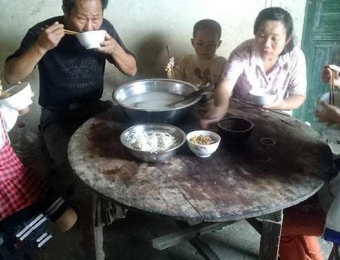 图中的男子因家庭条件困难到了40几岁才娶妻,但是妻子是一名癫痫病者,要常年吃药,婚后有了四个孩子,老大,老二,老三都是女孩,因为老观念又生了一个孩子,还好第四个孩子是个男孩。但是很不幸的大女儿已经溺水身亡。图中是一家五口在吃饭。