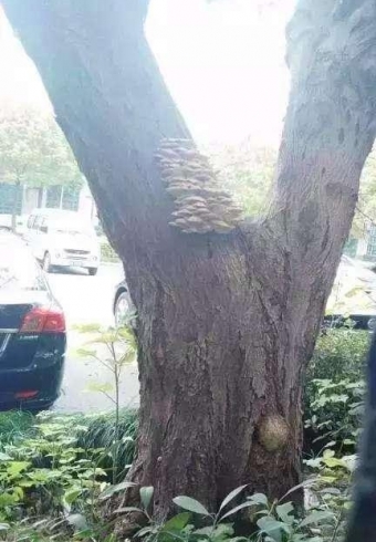 最近,杭州沈半路人行道旁的一棵大树上长出了一丛巨大的平菇,足足有6斤重,引来许多人的围观。