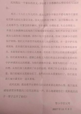 现代快报讯 近日,盐城市城南新区城管局长收到一封匿名信,打开一看才知道是三名城管队员做好事不留名。现代快报记者了解到,原来一19岁女孩骑电瓶车摔倒受伤,满脸是血,路过的三名城管队员第一时间开车送医救治,又帮助转院,一直陪在女孩身边,直到家人赶