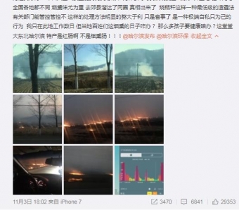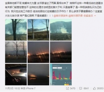 11月1日至3日,演员孙艺洲微博接连发文称哈尔滨市空气质量较差,并将矛头直指秸秆焚烧现象,引发公众关注,演员佟大为也通过认证微博呼吁哈市治理秸秆焚烧问题。