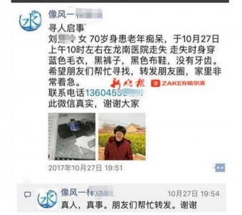 10月27日,一则“ 刘某,女,70 岁,身患老年痴呆,于10月27日上午10时左右在龙南医院医院走失,希望朋友们帮助寻找。”寻人启示消息在大庆市市民的朋友圈中被快速转发。最终,这场全城爱心寻找接力,最终哈尔滨铁路公安局齐齐哈尔铁路公安处大庆站派出所民警