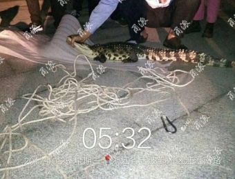 10月25日清晨5时多,宁波鄞州新城派出所接到报警,有市民在东部新城甬新河边钓鱼时,发现河里有一条鳄鱼!警方组织4名警力下河进行抓捕。