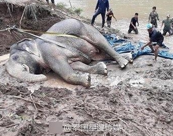 大象失足堕河 人们合力将其拉上岸