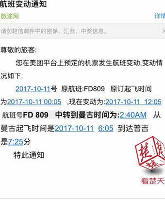 楚天都市报10月19日讯 今日,武汉市民汤女士反映,她通过旅途网购买了10月11日去泰国普吉岛的机票,后来客服通知她航班变动时,起飞时间出了错,导致她和男友误机误事。