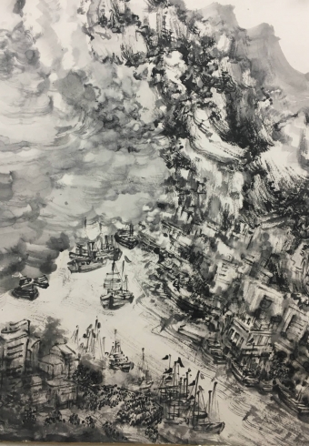 万顷波涛止于巍峨山脚,巨轮鱼贯驶入港湾,云雾升腾开图千里……在“山海经黄唯理近作展”上,一批表现广东沿海风貌的山水画在山之巅、海之端取景造境,静谧悠远的传统山水意境被注入了气象磅礴的现代感。