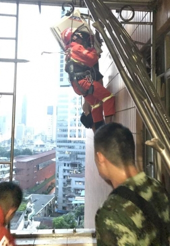 广州市公安消防局今日(8日)通报,10月7日17时28分,有群众报警称,一名男子不慎从越秀区仓边路一栋大厦楼顶天台跌落到17楼,并挂在了空调架上。市119指挥中心接警后随即调派越秀、恒福消防中队,4台消防车20名指战员到现场开展营救。