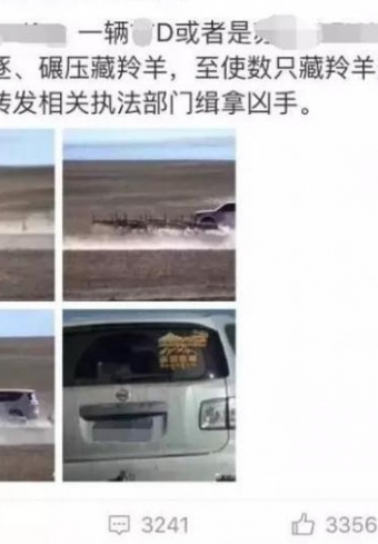 10月6日,一则“两辆外地牌号的越野车在西藏追逐碾压藏羚羊”的消息在微信朋友圈广泛传播。有网友称,车辆在追逐过程中致数只藏羚羊死亡。