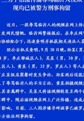 @临沂网警巡查执法10月3日消息,近日,一段辱骂临沂人的视频在网上传播,引发网民愤慨,临沂网警接报后,在枣庄网警的协助配合下,迅速查明并抓获相关违法人员。