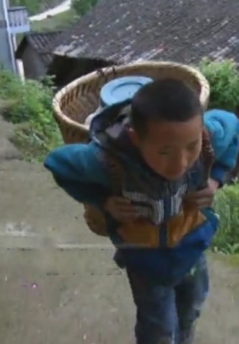 图中这个背着水的男孩十一岁了,自己还没有通水管,想要喝水只能用老方法去背。