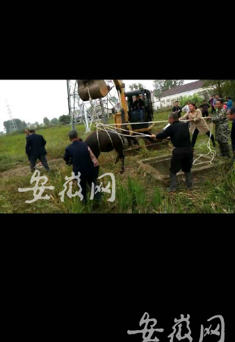 新安晚报 安徽网讯 10月1日上午,一头约1吨重水牛,不知是何原因掉入霍邱县马店镇一口电缆井中。为此,民警调来挖掘机救牛。