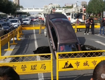 道路坍塌 500万劳斯莱斯扎进2米深坑|组图