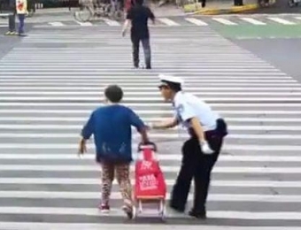 日前,在济南经十千佛山路口,一老奶奶执意闯红灯过马路,交警立即上前劝阻。