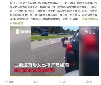 美国佛罗里达州一条公路上,一名女子开车时被后方轿车疾驰超车吓了一跳,就摁了喇叭表达不满。没想到之后在路口等红灯时,超车轿车上的一对“路怒”母女对摁喇叭的女子不停尖叫,并将女子拖出车外一顿暴揍,致使女子鼻梁被打断陷入昏迷。后车一名男司机发现情