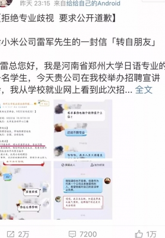 负责宣讲的秦先生说:“……如果你是日语专业的学生,那你可以走了,或者我建议你们去从事电影事业。”事后,他已在微博上致歉。
