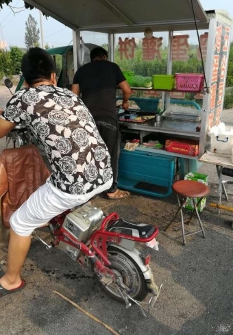 在鲁北县城的早上有这么也这个小伙子,在路边摆摊,卖鸡蛋灌饼。