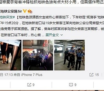 9月21日五点左右,南京地铁警方发布了一条消息:今天下午15点20分,在地铁新街口站19岁女乘客汪某向地铁公安分局乘警大队武装民警求助,指认被身旁男子郭某猥亵。据了解,乘车时郭某将手贴在女乘客汪某臀部,被旁边的热心乘客拍下。在新街口站下车时,热心乘