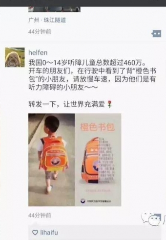 “开车的朋友,如果在行驶途中看到背橙色书包的小朋友,请放慢车速,因为他们是有听力障碍的小朋友。”