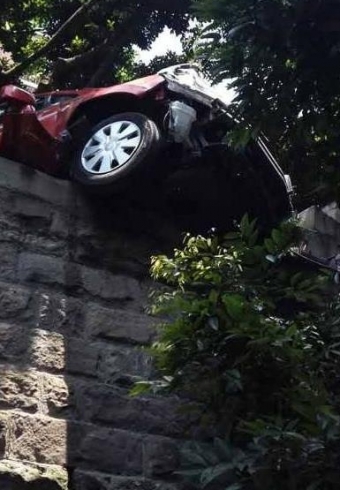 原标题:重庆一小轿车撞倒围墙 车头悬空