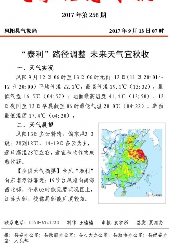 【“泰利”路径调整 未来天气宜秋收】凤阳今天多云转晴;偏东风2-3级;28到18℃。14-19日多云为主,逐日高温28℃左右,适宜秋收作物成熟收获。