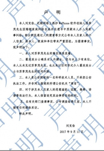12 日下午,备受关注的 " 程序员自杀事件 " 中,女方翟某欣的舅舅刘克俭给北青报记者发来个人声明称:" 本人对苏享茂先生的离世深表哀痛。翟欣欣女士确系本人外甥女,但与本人少有来往。本人从未见过苏享茂先生,也从未以任何形式介入翟欣欣女士与苏享茂先生