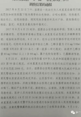 “湟源公安”微信公号9月12日消息,2017年8月22日下午,湟源县一违法行为人米某某在接受行政处罚告知时突然服下随身携带的白色物体,后呕吐晕倒,经抢救无效后死亡。经现场勘查、调阅现场录像资料及对尸体、提取物进行检验、鉴定:米某某系氰化物中毒死亡。