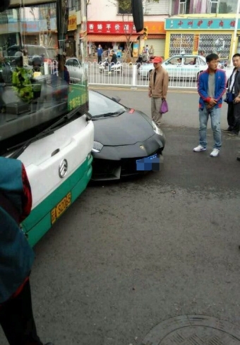 一辆600多万的兰博基尼LP700因为转弯撞上了一辆直行的公交车,车主下车一看发现维修费用要十万块钱,蒙了。