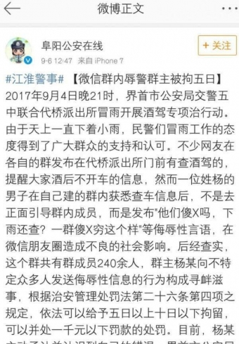 据安徽阜阳市公安局官方微博消息,9月4日晚21时,阜阳界首市公安局交警五中联合代桥派出所开展酒驾专项治行动。阜阳公安局称,目前,杨某主动承认并认识到自己的错误,界首市公安局依法对其作出行政拘留五日的处罚。