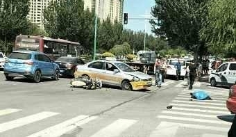 9月2日中午11点左右,在河滨路与长沈路路口发生一起车祸,一辆大回的出租车与一辆直行的电动摩托车相撞,出租车发动机破损严重,一辆电动摩托车横在车前,电动摩托车司机被撞翻在地,由于受伤较重,男子不幸身亡。