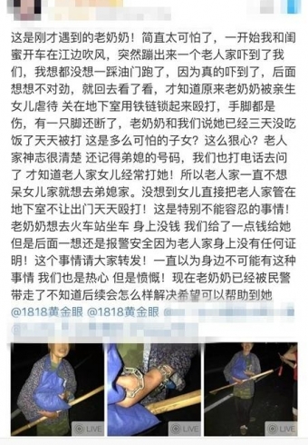老人手戴铁链称被子女虐打关地下室 警方:患精神病