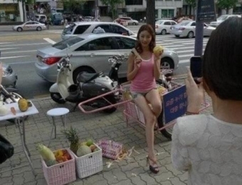 在韩国街头上,有一位穿戴时髦、身段姣好的美女在路旁边摆摊卖生果。