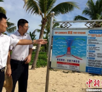 中国首批裂流警示标识已经在海南三亚、陵水的重点滨海旅游区树立。8月31日,海南陵水黎族自治县常务副县长孟庆垒(左)向记者介绍树立在陵水重点滨海旅游区的裂流警示标识。阮煜琳摄中新网三亚8月31日电(记者阮煜琳)中国国家海洋局官员31日在三亚表示,为提升公众