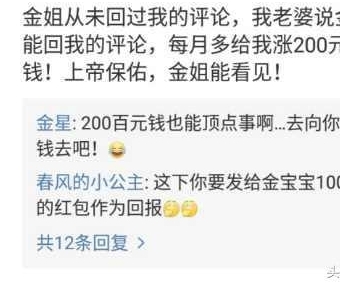 老婆不给零花钱怎么办?近日,网友“冷藏中n年”在金星的微博下评论“金姐从未回过我的评论,我老婆说金姐要是能回我的评论,每月多给我涨200元的零花钱!上帝保佑,金姐能看见!”希望通过金星的支持,向老婆获取零花钱。