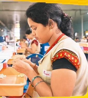 成立于2004年的厦门姚明织带饰品有限公司是一家专门生产丝带及相关饰品的纺织企业。2014年,姚明织带在印度东部城市维沙卡帕特南建立工厂,开展出境加工业务,解决了数百名当地人的就业问题。图为在位于印度维沙卡帕特南的姚明织带印度工厂,女工在生产线上编织。