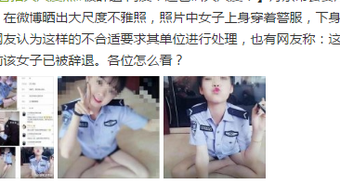 【女辅警拍大尺度照被辞退 网友:这也叫大尺度?】丹东市公安局振兴分局一女辅警,在微博晒出大尺度不雅照,照片中女子上身穿着警服,下身着平角短裤。有网友认为这样的不合适要求其单位进行处理,也有网友称:这也叫大尺度?目前该女子已被辞退。各位怎么看