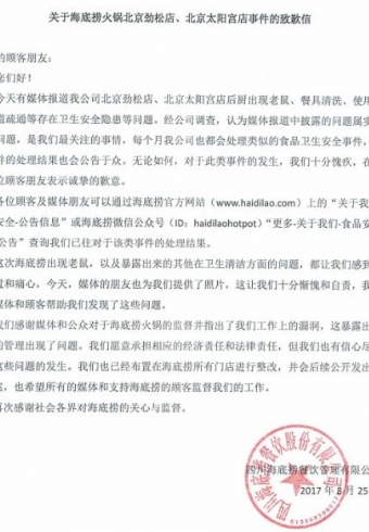 原标题:关于海底捞火锅北京劲松店、北京太阳宫店事件的致歉信 海底捞回应全文。 早前报道: 媒体暗访海底捞:老鼠爬进食品柜 火锅漏勺掏下水道 法制晚报·看法新闻(记者/暗访组)老鼠在后厨地上乱窜、打扫卫生的簸箕和餐具同池混洗、用顾客使用的火锅漏勺