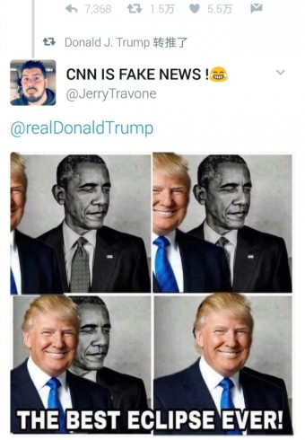 原标题:特朗普转发网友“最佳日食”推文,借“日食”黑奥巴马8月24日,美国总统特朗普在自己的推特账号上转发了一条来自网友的图片推文,题为“有