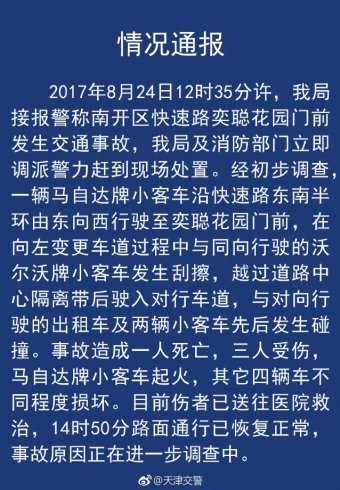 原标题:南开区5车连环相撞致1死3伤24日中午,天津南开区发生一起惨烈车祸。据@平安天津通报,一辆黑色马自达行驶中突然变道,与同向车刮擦后驶入对向车道,与对向出租车猛烈撞击,又波及两小客车,马自达着火