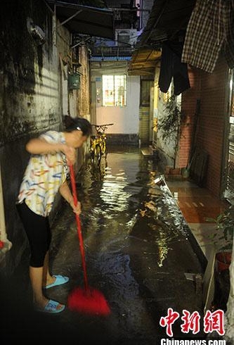 8月23日傍晚,广州南华东路、小港路一带居民纷纷清理门前积水。中新社记者梁永强摄8月23日,受今年第13号台风"天鸽"影响,广州出现珠江水倒灌现象,多处道路和居民生活区成"泽国",给市民生活和出行带来诸多不便。8月23日傍晚,广州南华东路、小港路一带居民纷纷清
